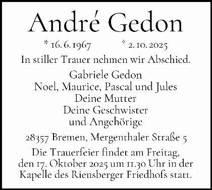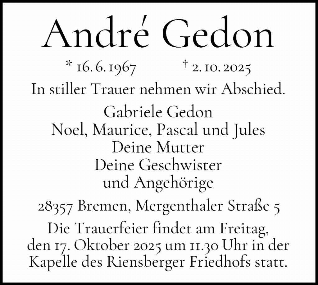 Die Trauerfeier findet am Freitag, den 17. Oktober 2025 um 11.30 Uhr in der Kapelle des Riensberger Friedhofs statt.